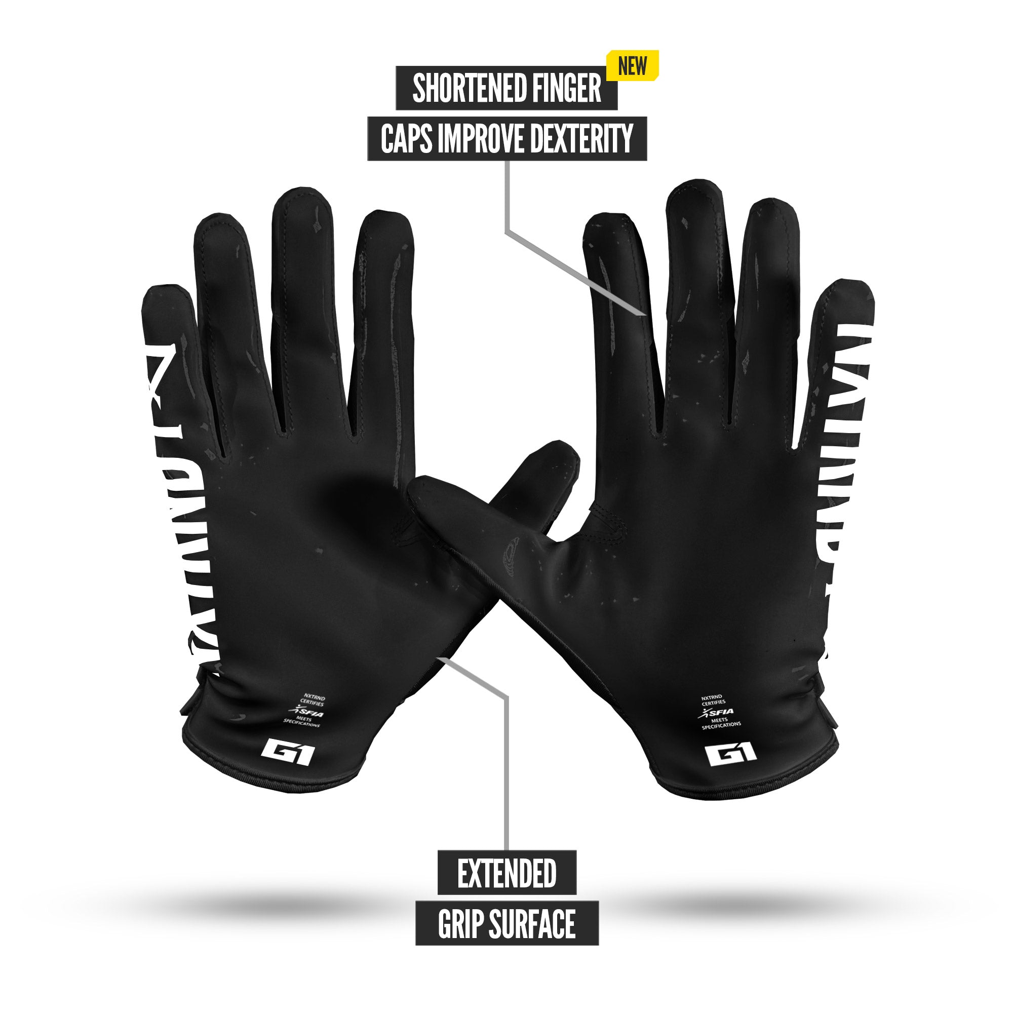Play like the pros with NXTRND G1 Pro® football gloves: reworked fit. shorter finger caps for better ball feel. and updated stitching to reduce bulk.